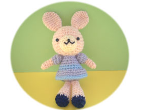 Fournitures : de la laine beige, mauve, bleu clair, bleu foncé, jaune, un crochet adapté, 2 boutons noir (pour les yeux) et un plus petit pour le nez, un peu de laine noire pour broder la bouche, et de la bourre.