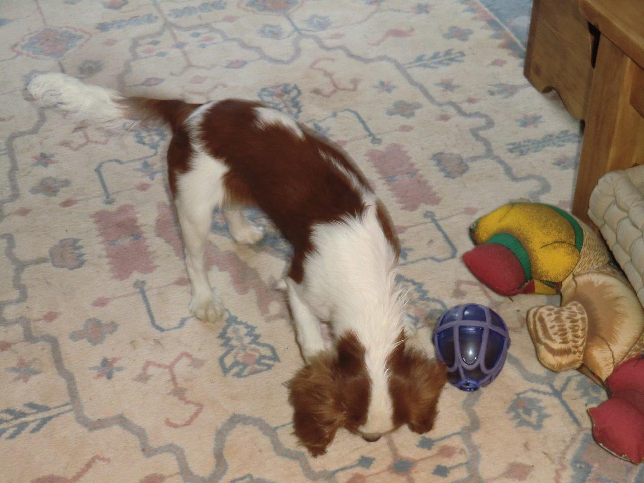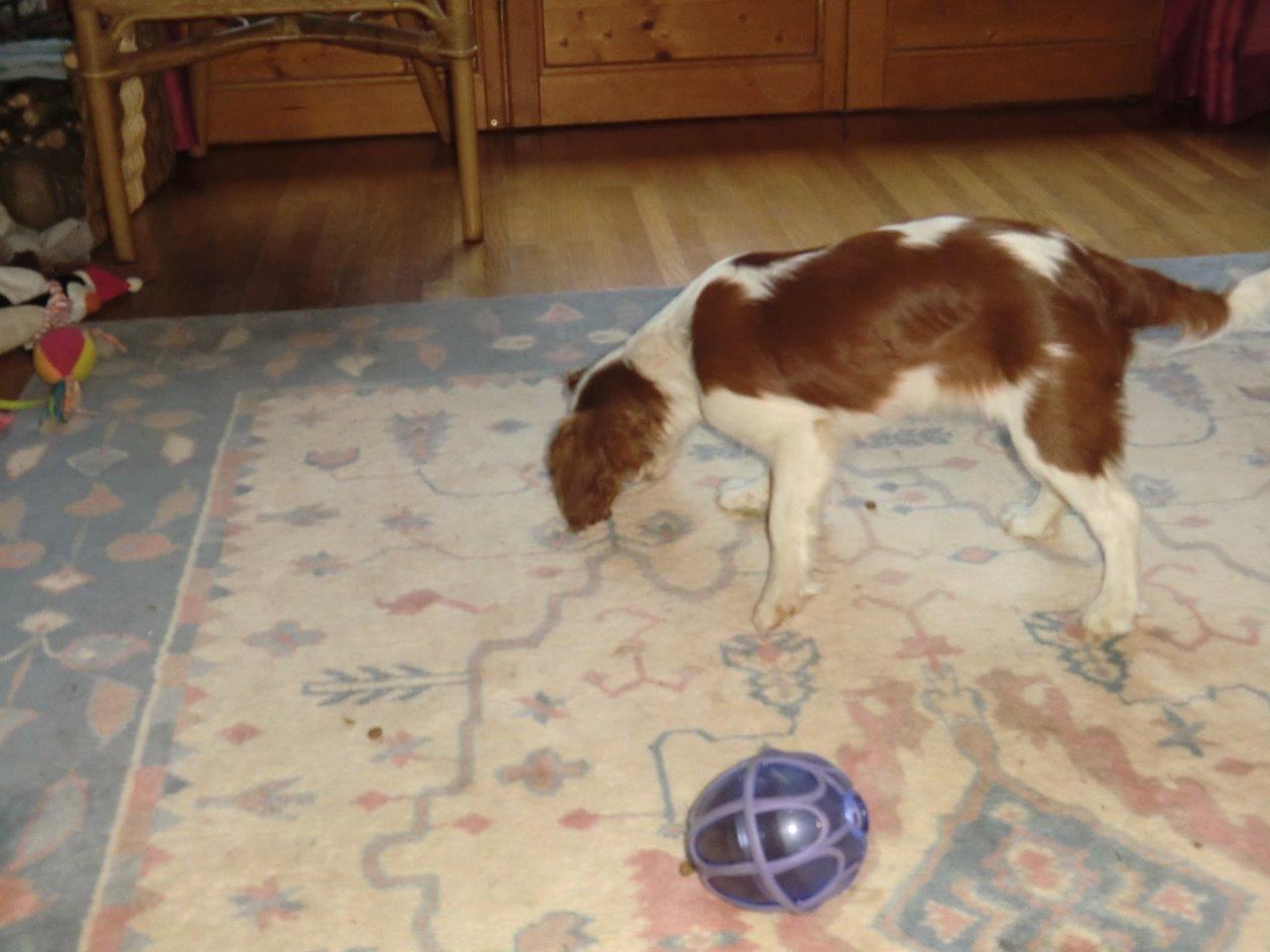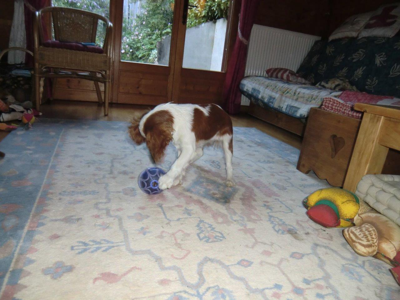 Le soir, les croquettes sont données dans la balle à croquette (merci Julie de nous l'avoir fait découvrir).