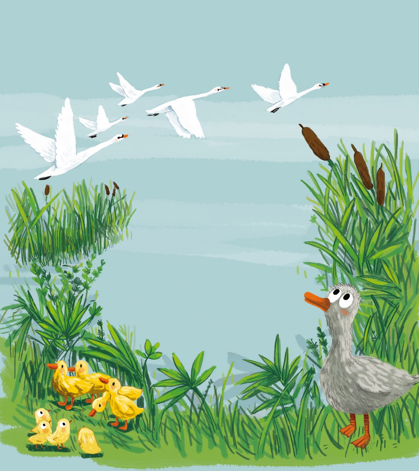 - Voilà un caneton vraiment différent, aucun des autres ne lui ressemble, il est gris et si gros ! Mais qu’importe ! Elle prit ses petits sous son aile, et tous ensemble partirent faire une promenade sur le lac. Le lendemain, il fit un temps délicieux alors, la mère cane vint présenter la nouvelle famille à tous les animaux de la basse-cour ; mais lorsque ceux-ci s’aperçurent de la différence du dernier venu, les réactions ne se firent pas attendre.