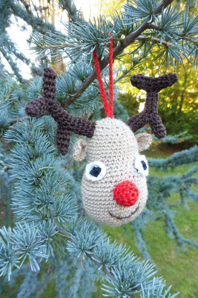 Coudre les bois en haut de la tête, plier les oreilles en double et les coudre de chaque côté. Coudre les yeux et le nez sur le devant de la tête. Broder la bouche en noir. Crocheter une chaînette d'environ 15 cm en rouge, et la coudre au milieu en haut de la tête.